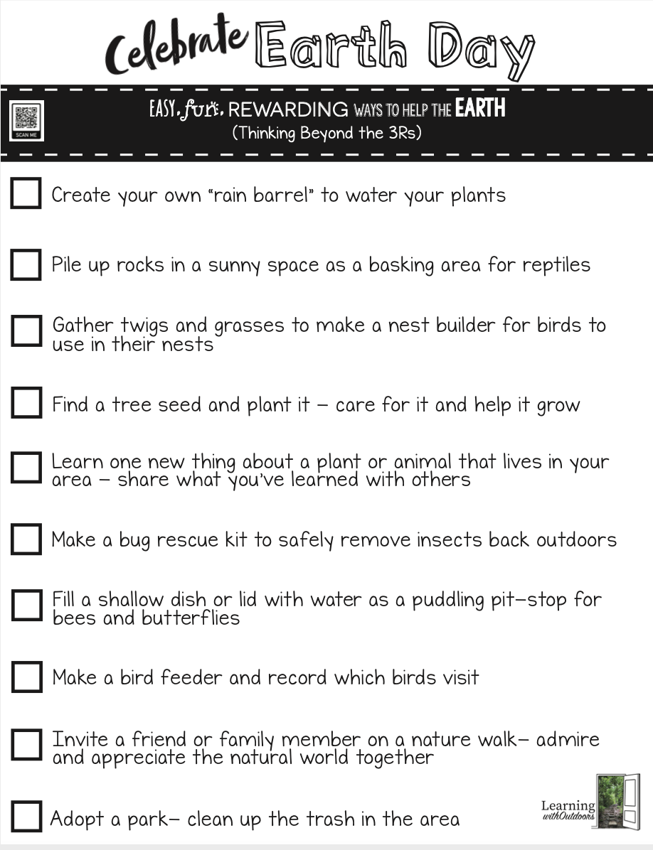 Use our Celebrate Earth Day Checklist to help children celebrate the Earth in a hands-on way in nature. Our list goes beyond the typical ‘reduce, reuse, recycle, ride a bike, and turn off the water list’ and instead focuses on how kids can really make a difference in the great outdoors focusing on Earth’s plants, animals, and green spaces.
