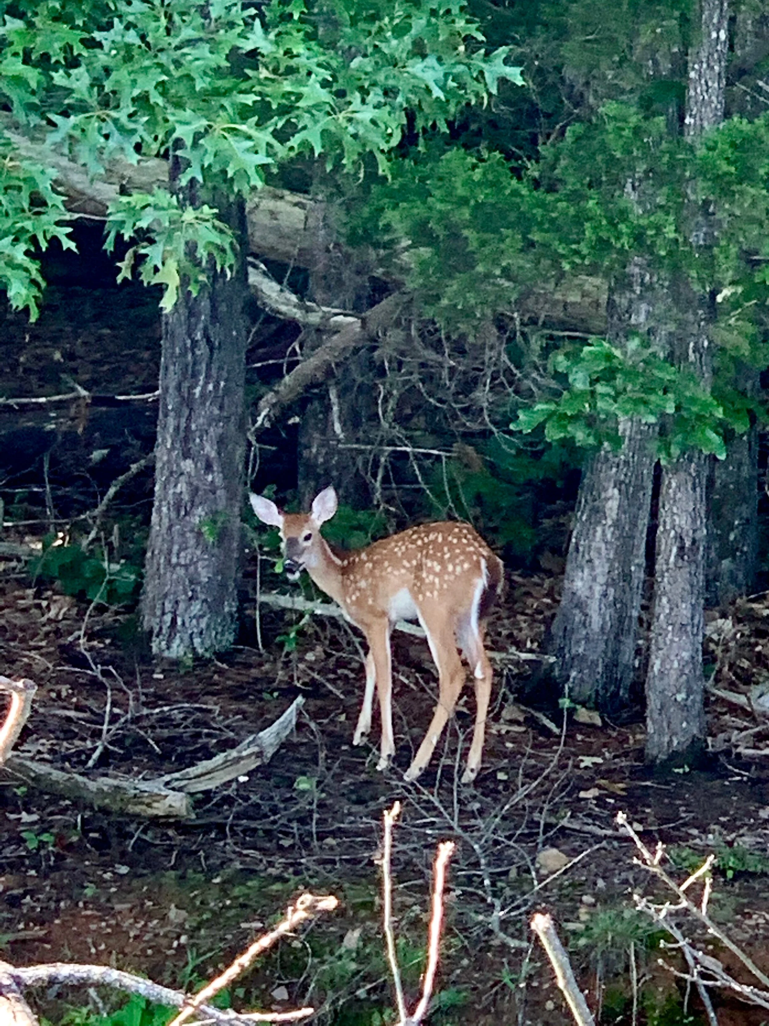 A fawn is born with reddish brown fur and rows of white spots along the back. This coloring allows the fawn to blend in with the forest floor and shadows. Fawn’s spots begin to fade when they are 3-4 months old, when they are better able to keep up with mom.