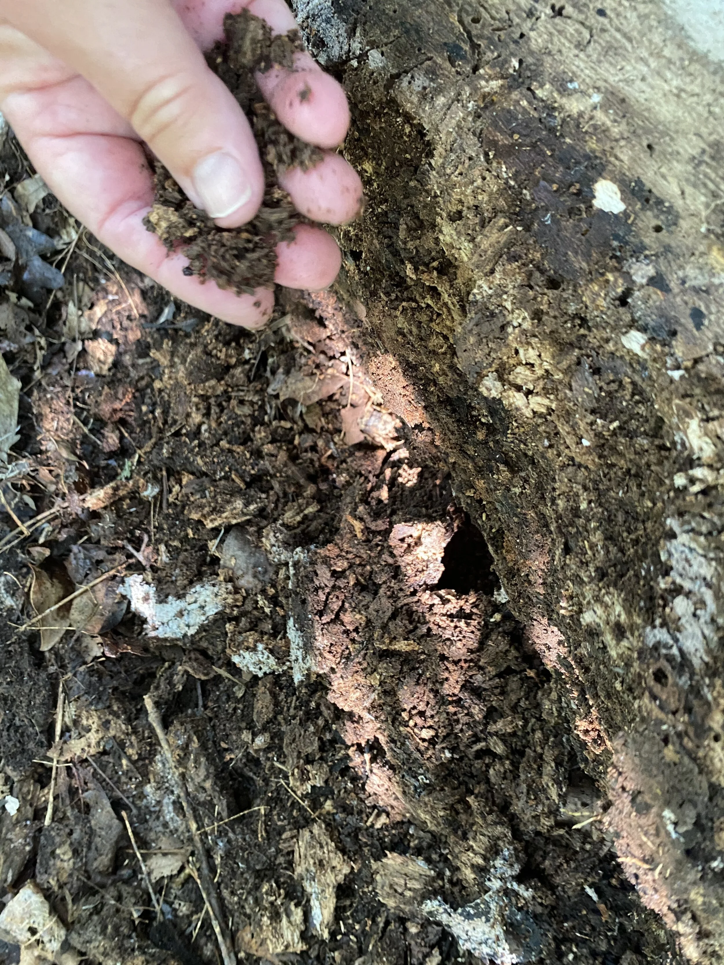 Be sure to use your senses and notice the smell of the decomposing wood and gently feel the texture of the crumbling wood in comparison to rough bark.